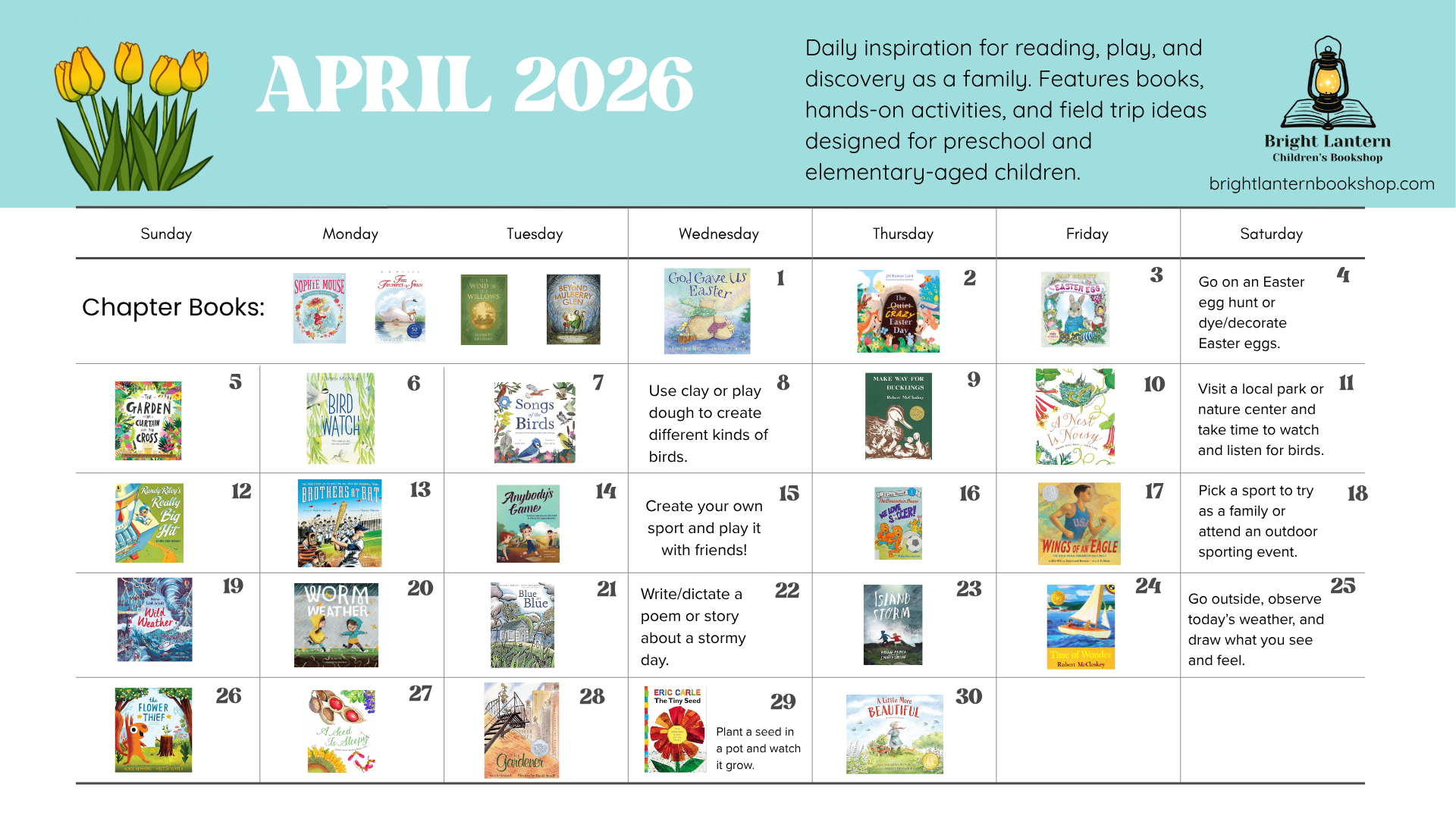 Bright Lantern Children’s BookshopRead. Play. Discover.Willow Spring, NC Bright Lantern’s Seasonal Favorites A Nest is Noisy The Flower Thief Up in the Garden and Down in the Dirt Are You an Ant? God Gave Us Easter Featured Read and Create Horse Bundle Little Horse Lovers Bundle Great Outdoors Bundle Forest Friends Bundle Little Learners Alphabet Bundle Shop More New Arrivals to our Local Bookshop! Featured If I Built a House The Friend Who Forgives Daniel and the Very Hungry Lions Beyond Mulberry Glen Garden Time (Hello World) Read, Play, and Discover Bundles Shop More Shop More Puzzles, Games, and Activity Books Featured Quick View My Very First Games - Forest Friends Quick View My Very First Games - Teddy's Colors and Shapes Quick View My Very First Games - Building Site Quick View King of the Dice Quick View Be Creative Every Day: My Year of Writing Shop More Where to Shop?Bright Lantern Children’s Book Nook Pop-Up Events Online Calling all teachers and homeschool families. We have an educator discount just for you! Find more information here. Follow us on Instagram